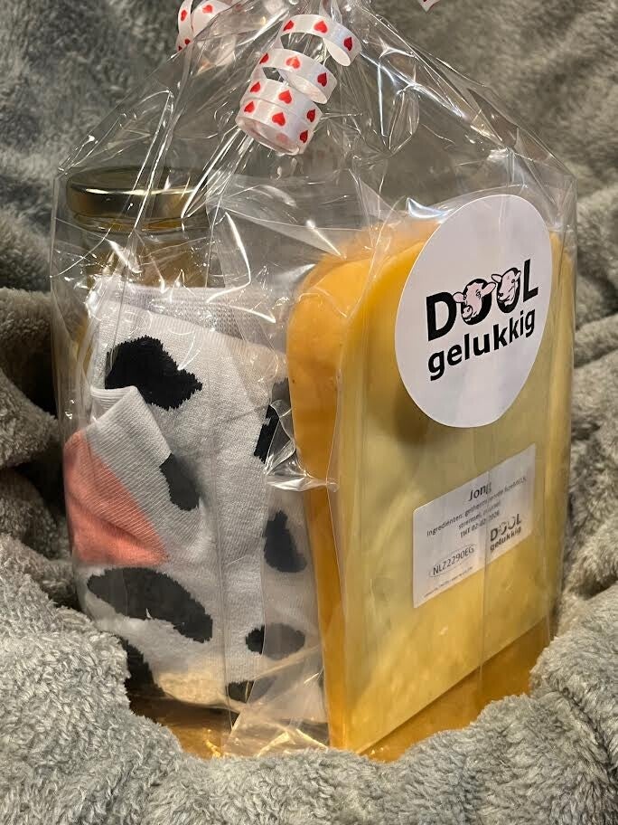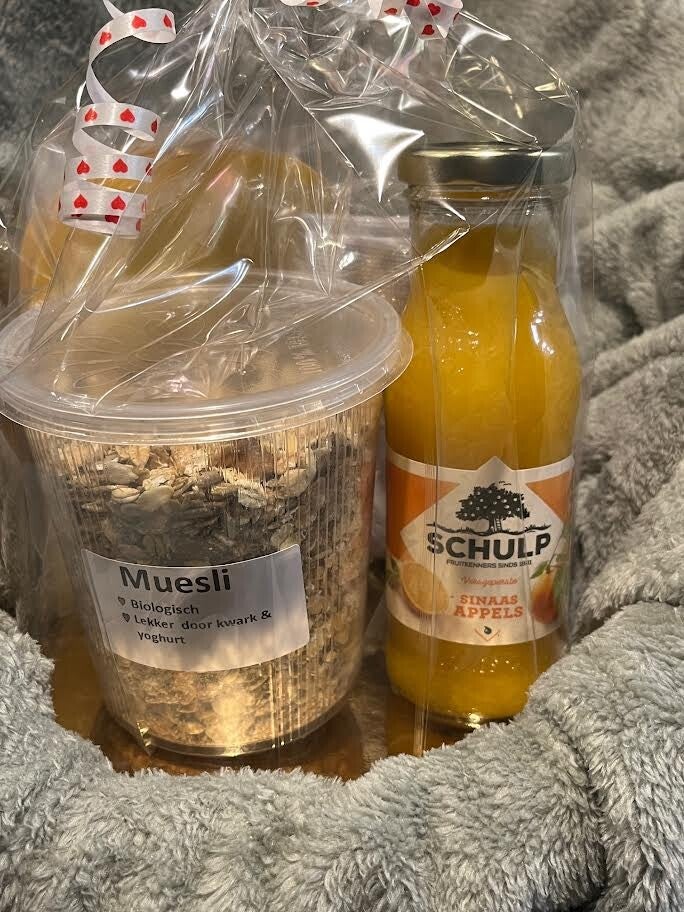Leuk kraampakket om te geven met jonge kaas, een sinaasappelsap, warme sokken en heerlijke muesli!